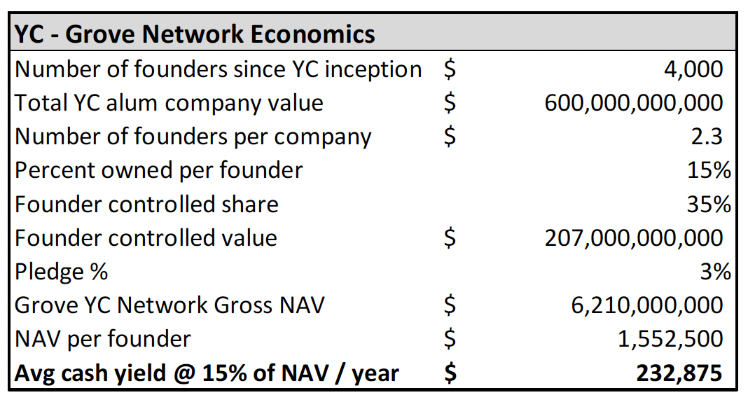 Given average per-founder ownership of their startups of 15% at the time of exit and our average Grove pledge amount of 3% of future liquidity, these metrics flow through to yield an average NAV per YC founder, since inception, of ~$1.55 million, or average cash yields from network participation of ~$230k / year.(23)